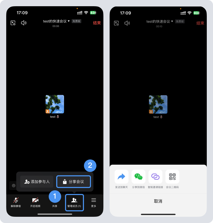 手机端支持点击【分享会议】把会议发送到聊天、分享到微信、复制邀请链接、生成会议二维码;