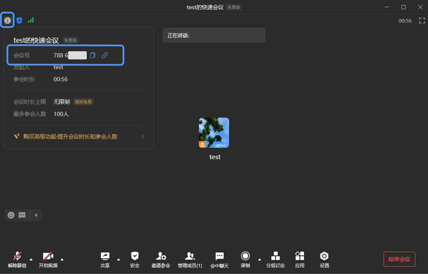 电脑端:点击会议主界面左上角“i”图标可以看会议号和复制会议链接。