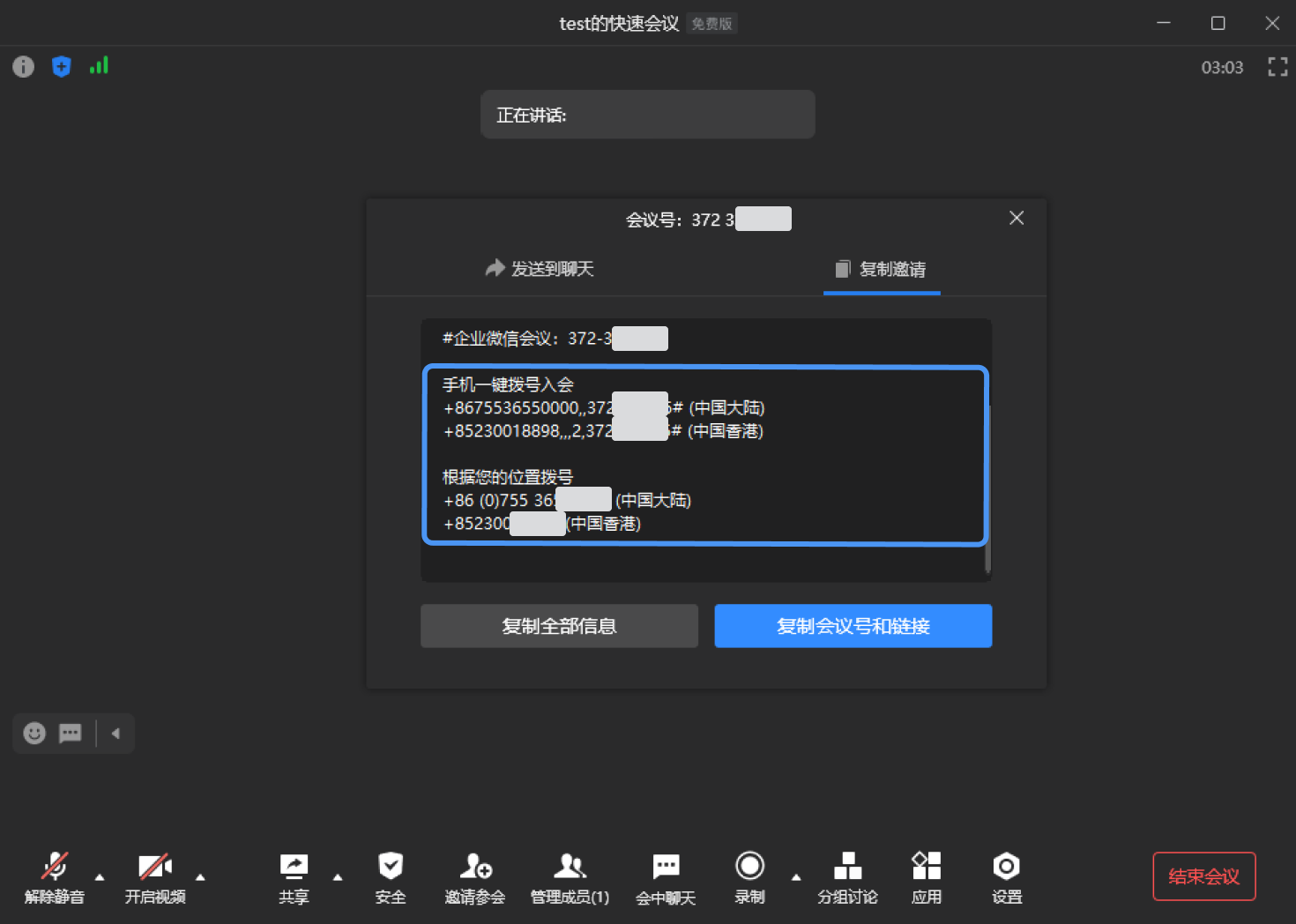(1)点击【邀请参会->分享会议->复制链接】支持查看到会议号,可使用腾讯会议app或登录企业微信【会议-加入会议】通过该会议号加入会议。