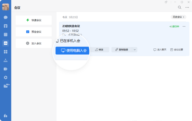 电脑端支持点击【邀请参会->分享会议】把会议发送到聊天。
