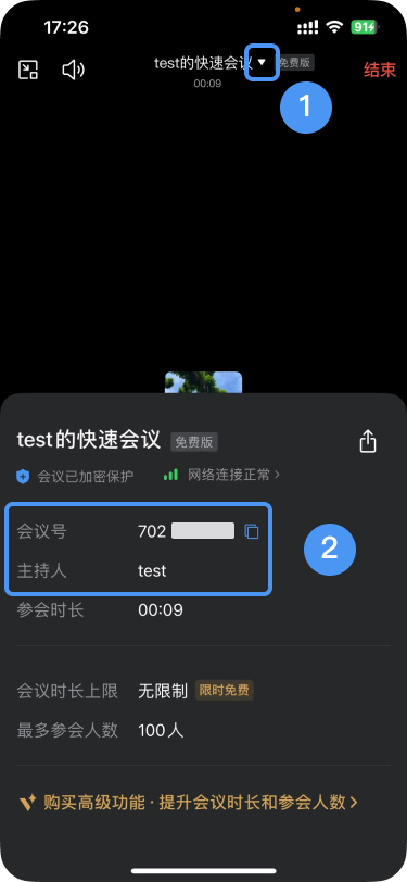 手机端:点击会议主界面会议名称旁边的“▽”可以看见会议号、复制会议链接、获取会议二维码。