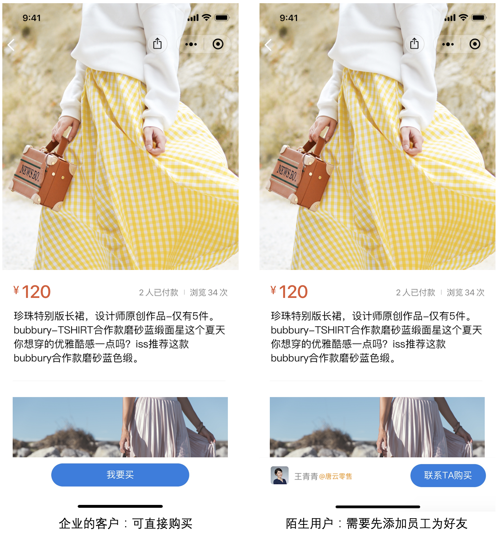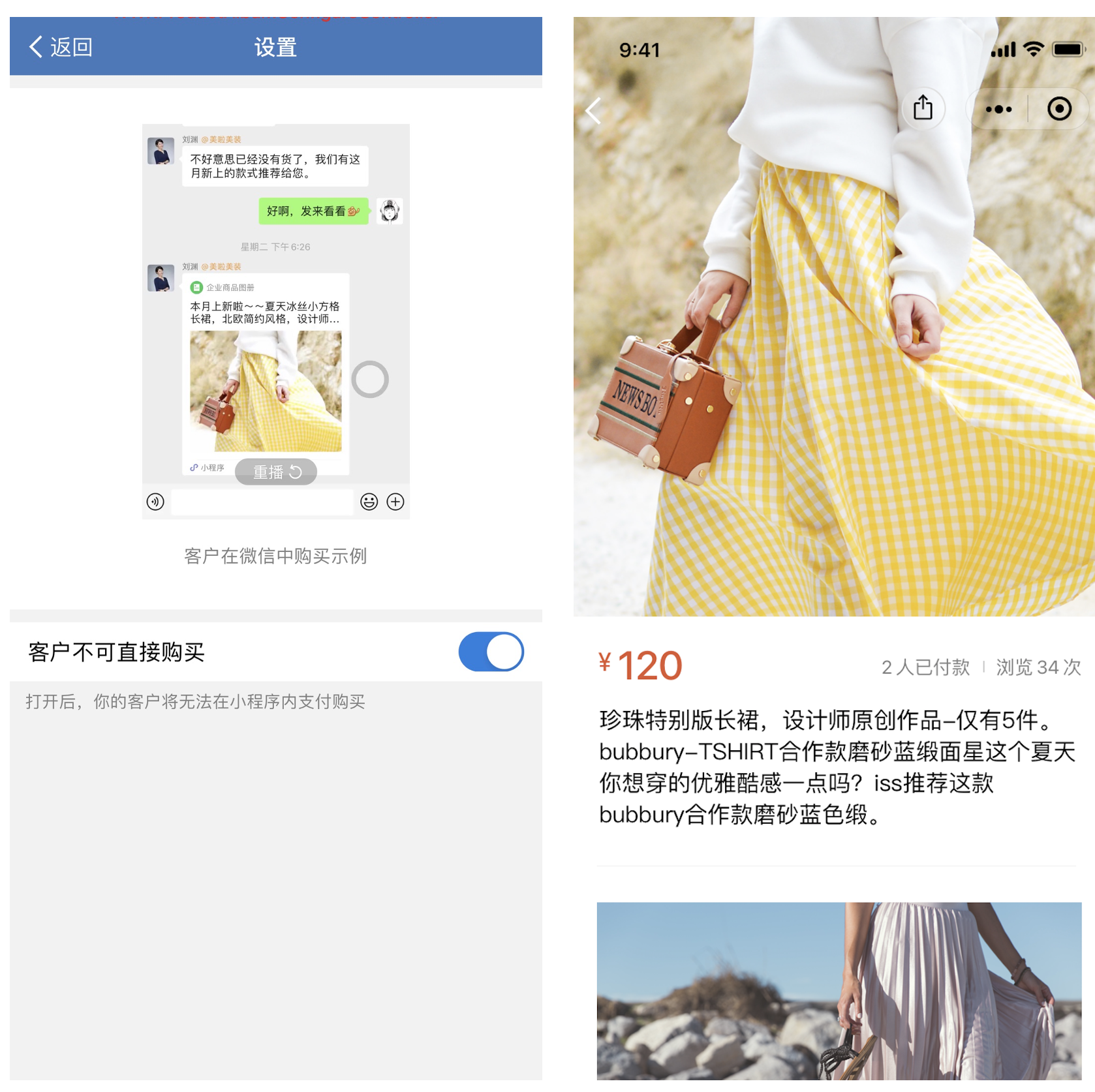 热门搜索:企业微信、企业微信会话存档、企业微信高级功能、企业微信上海服务商一、微信用户收到商品图册小程序卡片查看商品指引微信用户收到小程序卡片,点击进入商品详情页(或者长按识别二维码进入小程序),可浏览商品详情。 二、 微信用户收到商品图册小程序卡片可进行购买商品当微信用户是企业客户时,可以开通「对外收款」能力,开通后,客户可直接在商品图册小程序中付款。如果微信用户不是企业的客户,需要先添加企业员工为好友,或者进入企业的客户群,才能购买。 三、 商品图册里的商品支持关闭直接购买如果希望线下成交,可以开启「客户不可直接购买」开关,开启后,客户仅能浏览商品不能在线付款。 四、常见问题Q1:为什么使用商品图册购买付款时提示“支付信息有误”? Q2:为什么微信用户通过商品图册->去付款时,提示“系统繁忙,请稍后再试!” 热门搜索:企业微信、企业微信会话存档、企业微信高级功能、企业微信上海服务商